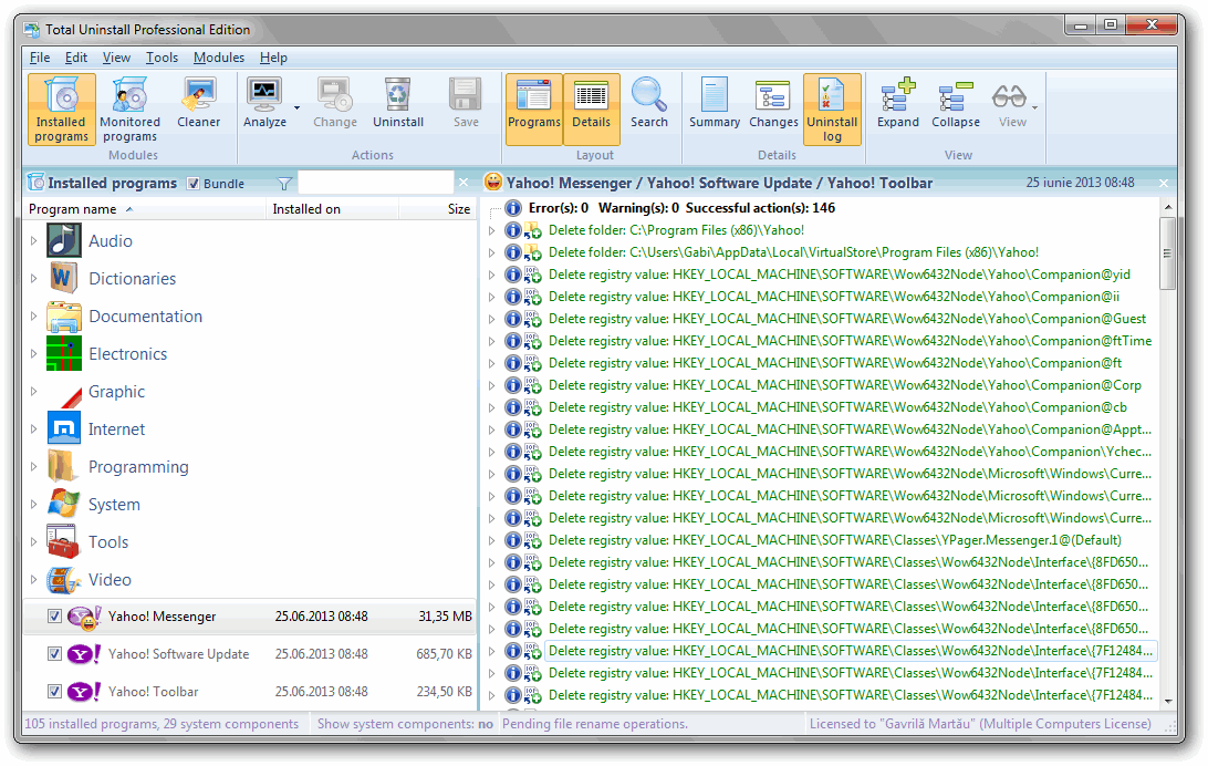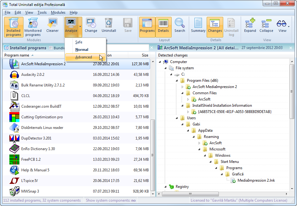 "已安装程序"模块可以分析现有的安装并创建包含安装更改的日志。即使不借助程序自带的"添加/删除"功能,它也能卸载程序。只需从列表中选择要卸载的程序,Total Uninstall 将在几秒钟内完成分析,并以树状视图显示检测到的文件、文件夹、注册表键和值。您可以查看详细信息并移除部分检测到的项目。之后,Total Uninstall 即可开始卸载。它会先运行程序自带的卸载程序,然后使用日志继续清除剩余项目。