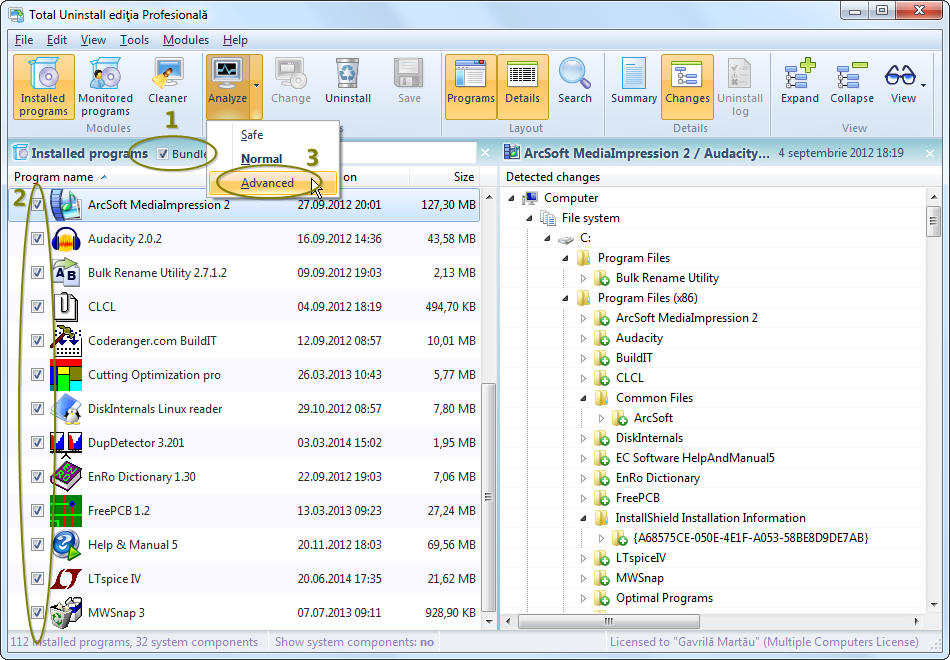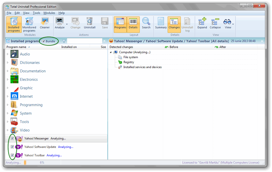 选择多个要卸载的程序。Total Uninstall 将自动启动捆绑分析过程。分析完成后,与所选程序相关的所有项目均可供审查。