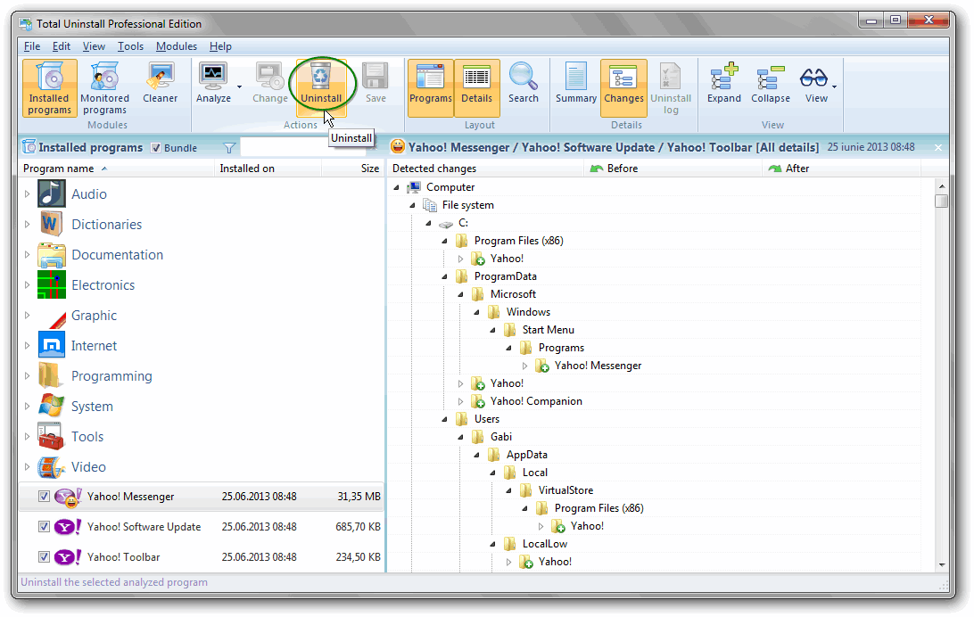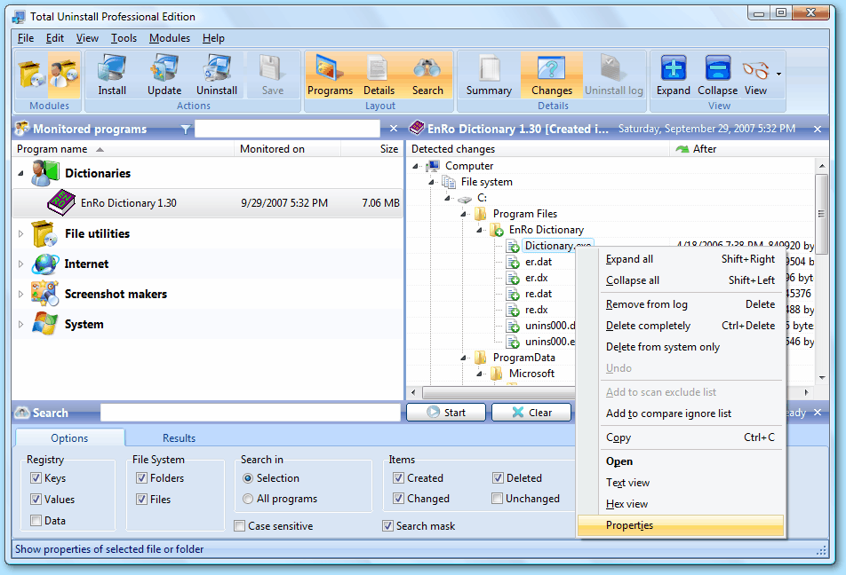 "监控程序"模块可以帮助监控安装新程序时对系统所做的所有更改。它允许您执行完整卸载,无需依赖程序自带的卸载程序——那些卸载程序可能会遗留文件或更改。Total Uninstall 会在安装新程序之前创建系统快照,安装完成后再创建一个快照,然后比较两个快照并以图形化树状视图显示所有更改,标记所有已添加、已更改或已删除的注册表值和/或文件。Total Uninstall 会保存这些更改,当您决定卸载该程序时,它会将更改还原到之前的状态。